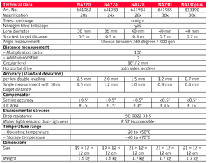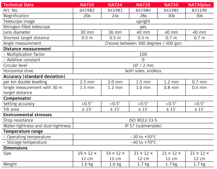 30x Power, Built for builders, engineers, and surveyors, nothing stops a Leica NA700 Series Automatic Level. A short drop onto the ground, a fall into water, vibration from heavy machinery, with a Leica NA700 level you can continue working. No time-consuming checking or readjustment required. And, the "best-in-class" optics enable you to always work as precisely as possible, even in twilight. What does this add up to? Reduced work downtime, thus translate into higher productivity, resulting in higher reliability and accuracy.
